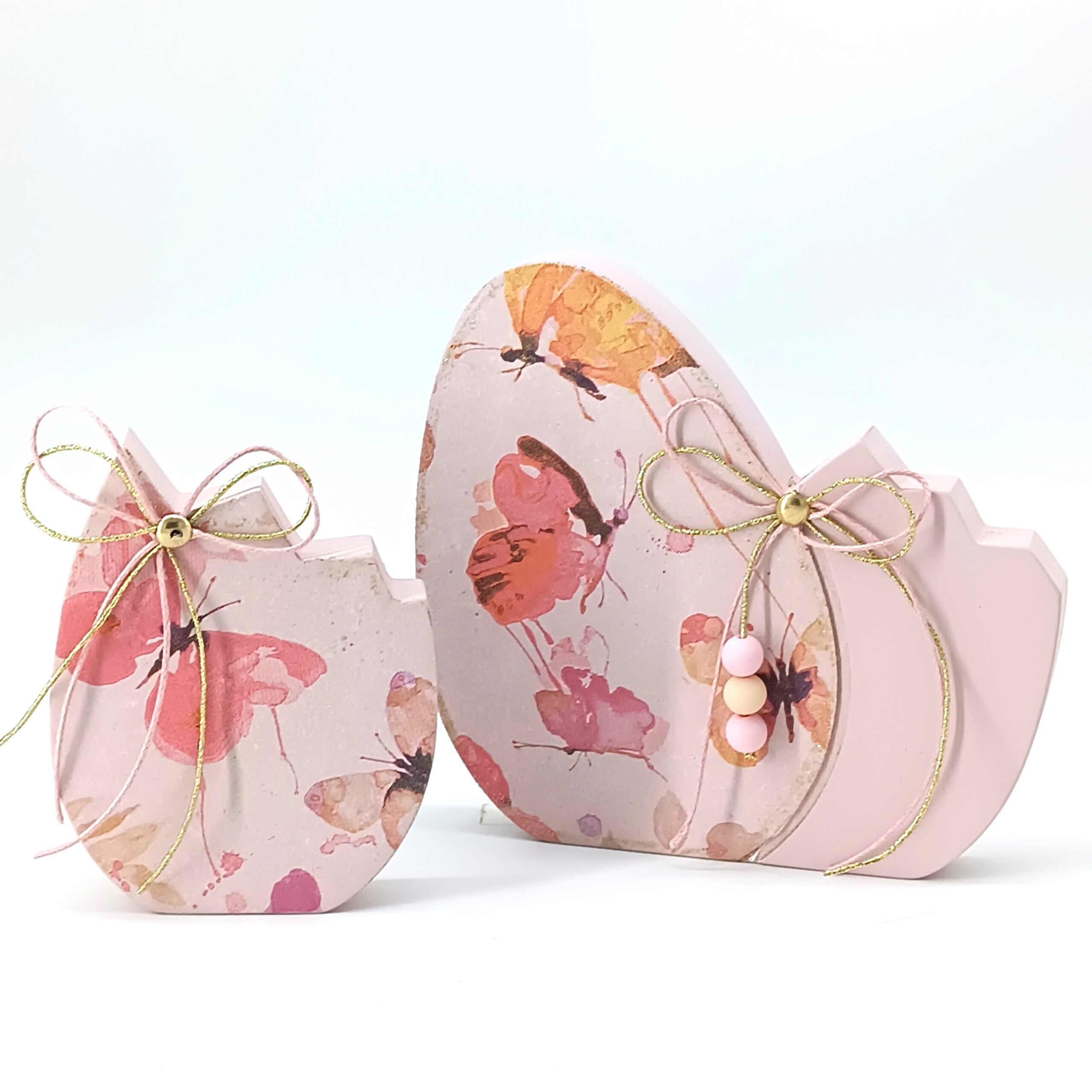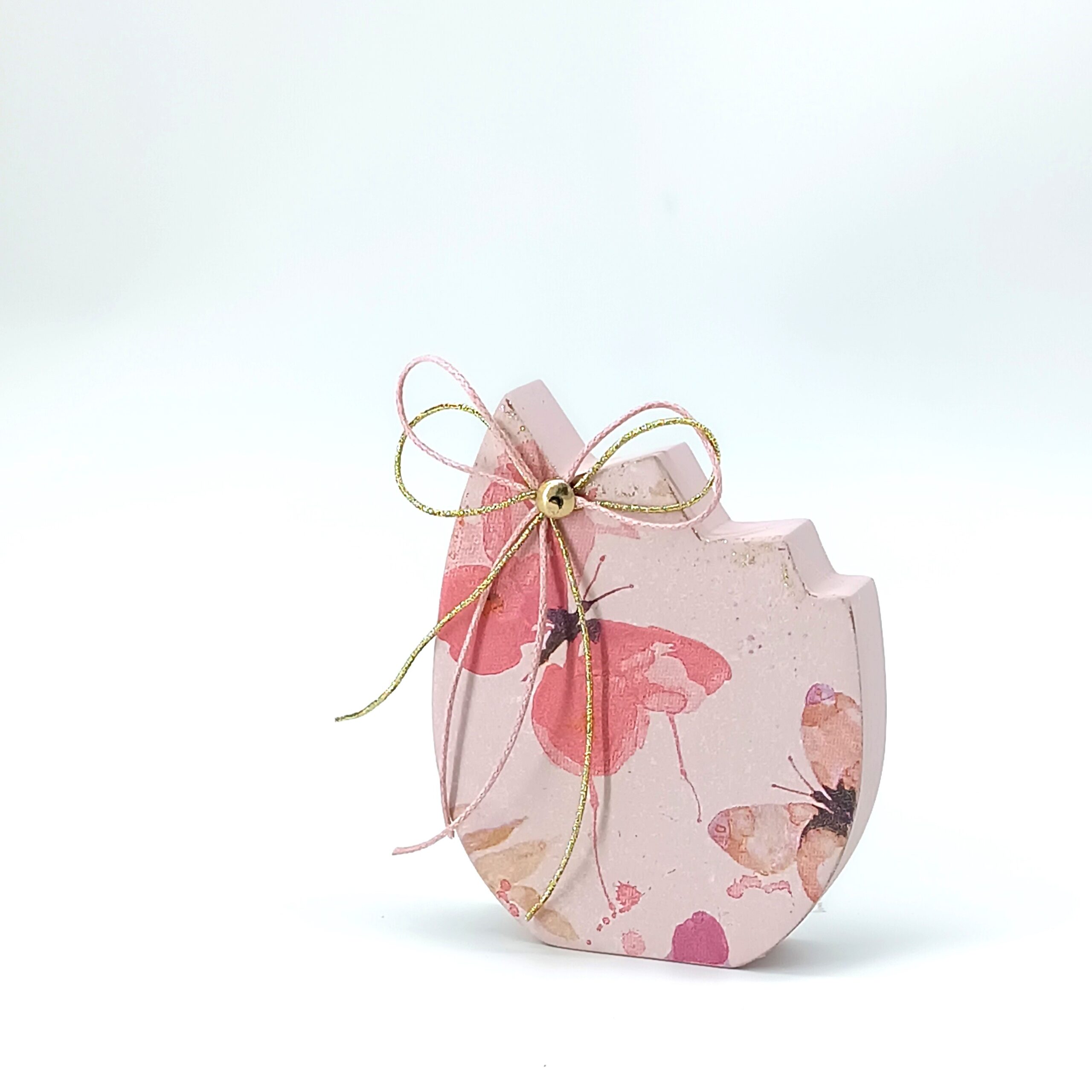 Ξύλινος πασχαλινός διακοσμητικός λαγός από mdf με την τεχνική του decoupage, ιδανικό για εποχιακή διακόσμηση ή δώρο.