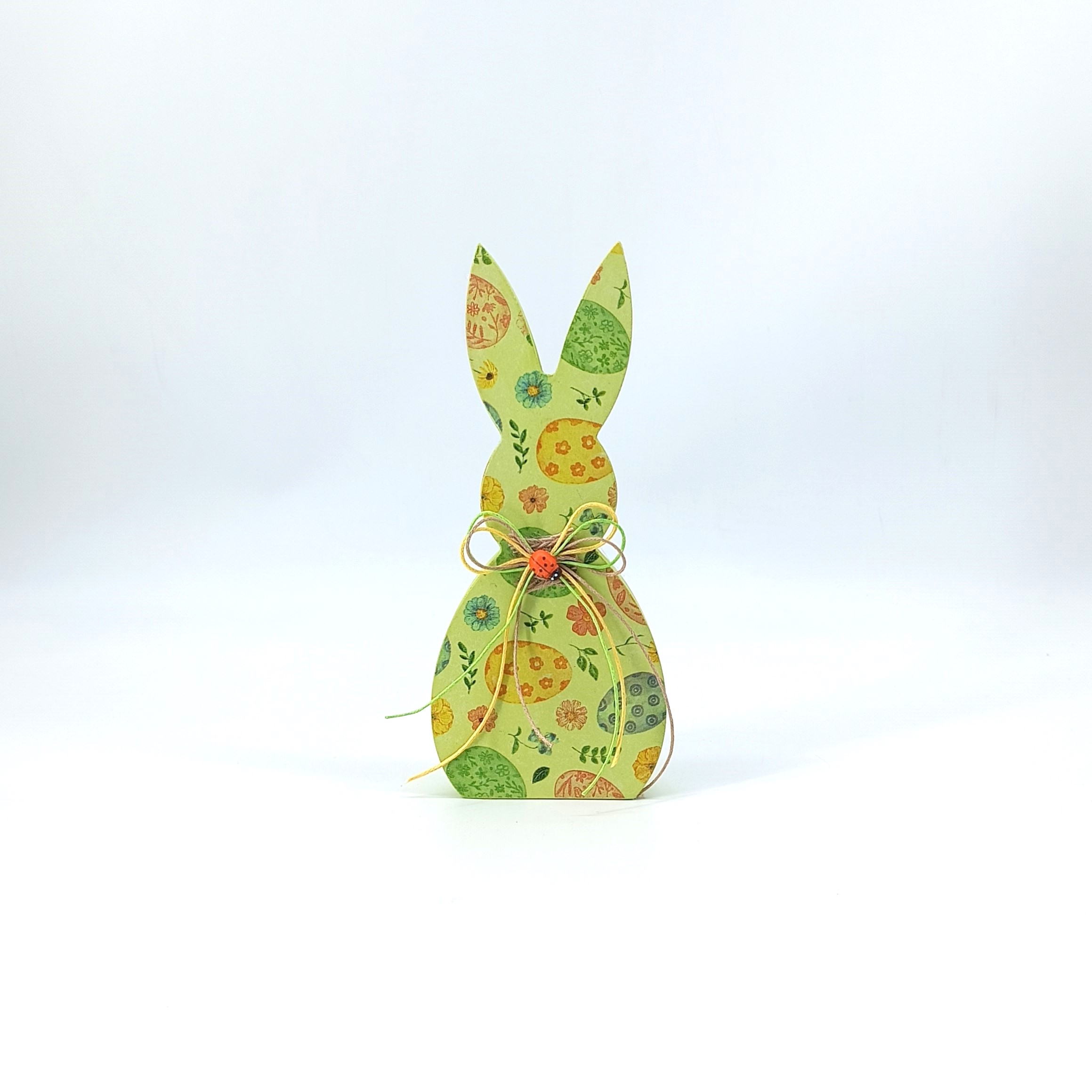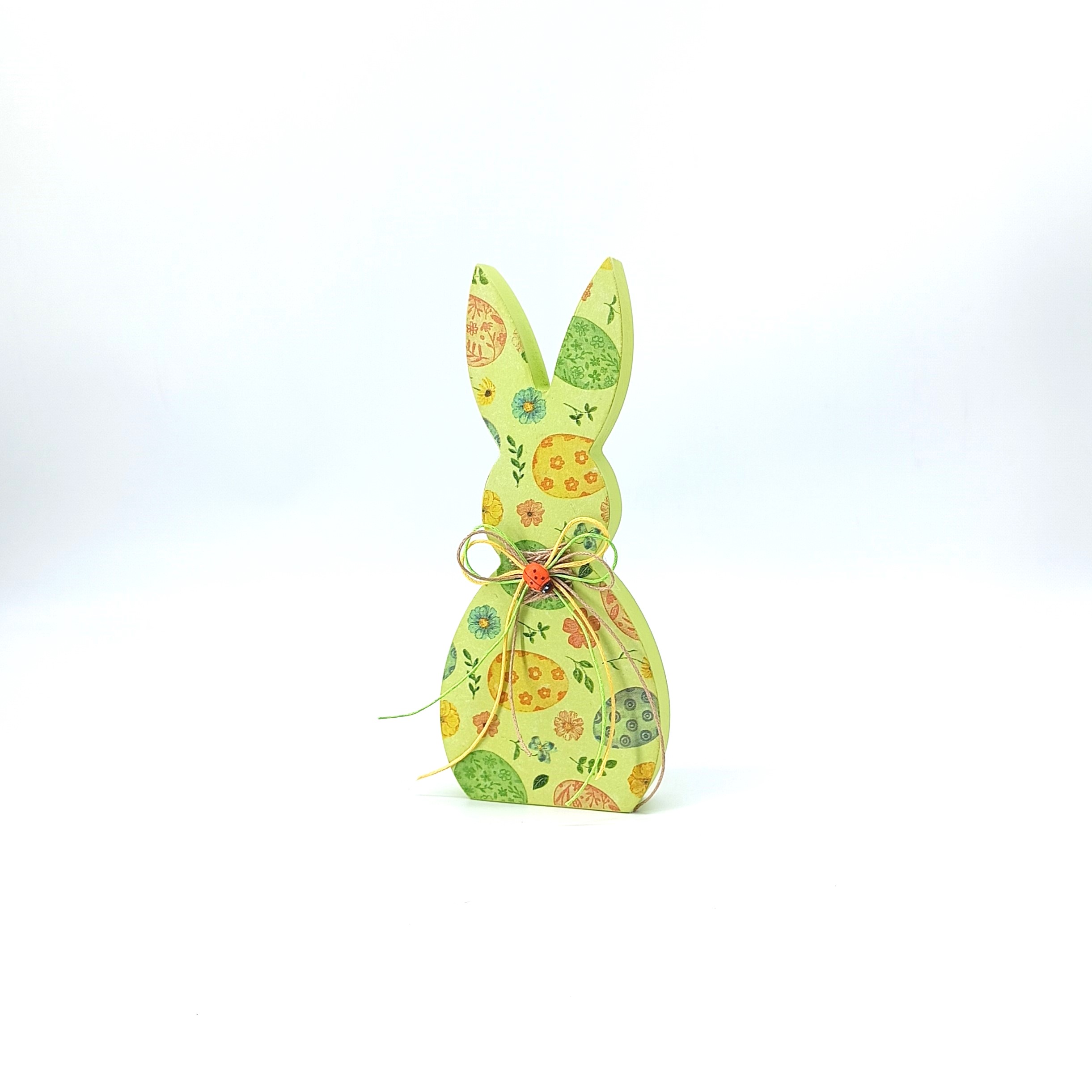 Ξύλινος πασχαλινός διακοσμητικός λαγός από mdf με την τεχνική του decoupage, ιδανικό για εποχιακή διακόσμηση ή δώρο.